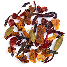 spiced blood orange: orange, hibiscus, rose hips, cinnamon, cloves, rose hips, cardamom pods, natural spicy cinnamon flavor & natural orange flavor