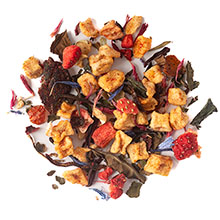 cranberry nut muffin green: green tea, apple pieces, cocoa nibs, cranberries, orange, raspberry leaves, red cornflowers, natural cranberry flavor, pecan flavor & natural vanilla flavor